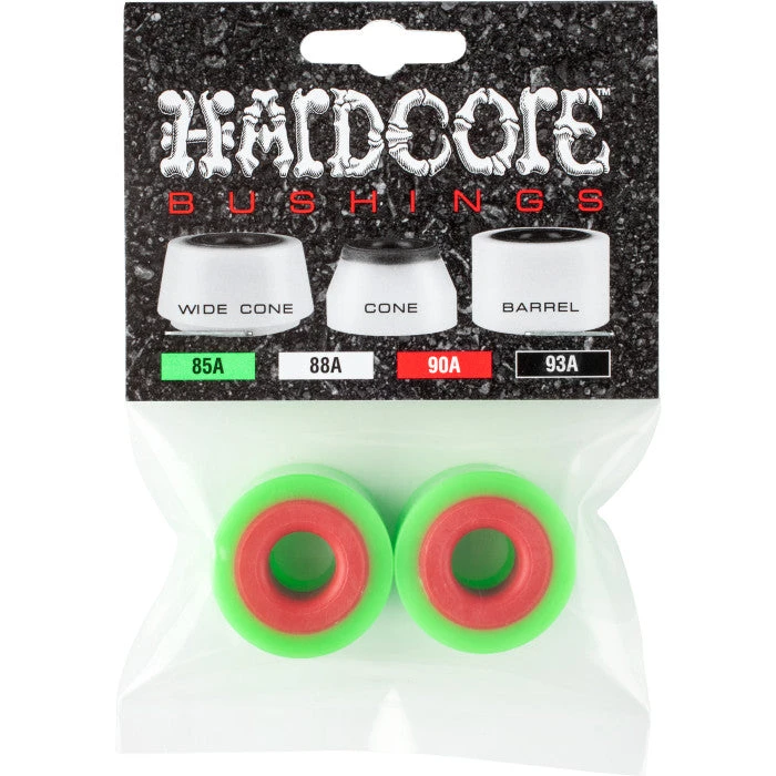 Hardcore Bushings feature the SkateOne™ patented bonded insert technology that will transform your trucks into high performance carving, racing, or freeride machines. The bonded insert will noticeably reduce slop, create a more fluid turn, add stability, and allow you to run a lower durometer bushing in your truck than normal. The insert locks your steering axis in without any extra parts and ensures you only compress the bushing top and bottom rather than open it like an elastic band.