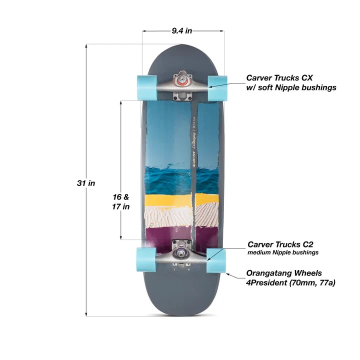 The epitome of flow has hit the pavement. Compact, comfortable, and agile, the Bolsa deck is Loaded’s spin on the stellar CX and C7 truck systems by Carver Skateboards with Orangatang wheels and bushings for a premium hard-carving surfskate experience.