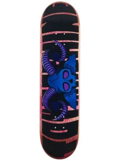 Charge forward and conquer the streets on the Toy Machine Horns Blue Deck 8.0 x 31.88. This partial bottom graphic features a ram horned Toy Machine monster over an assorted stain background. This pro quality skateboard deck is constructed from traditional 7-ply Maple wood with top stains that may differ from what is pictured. FREE sheet of Skate Warehouse griptape available when adding to shopping cart.