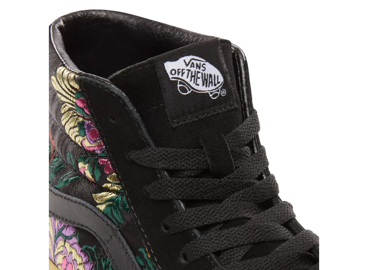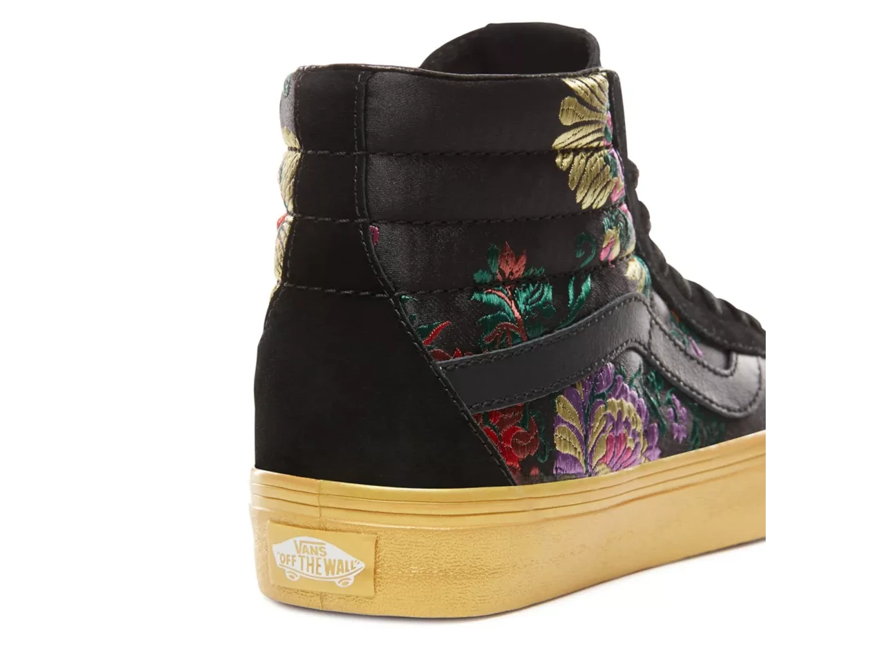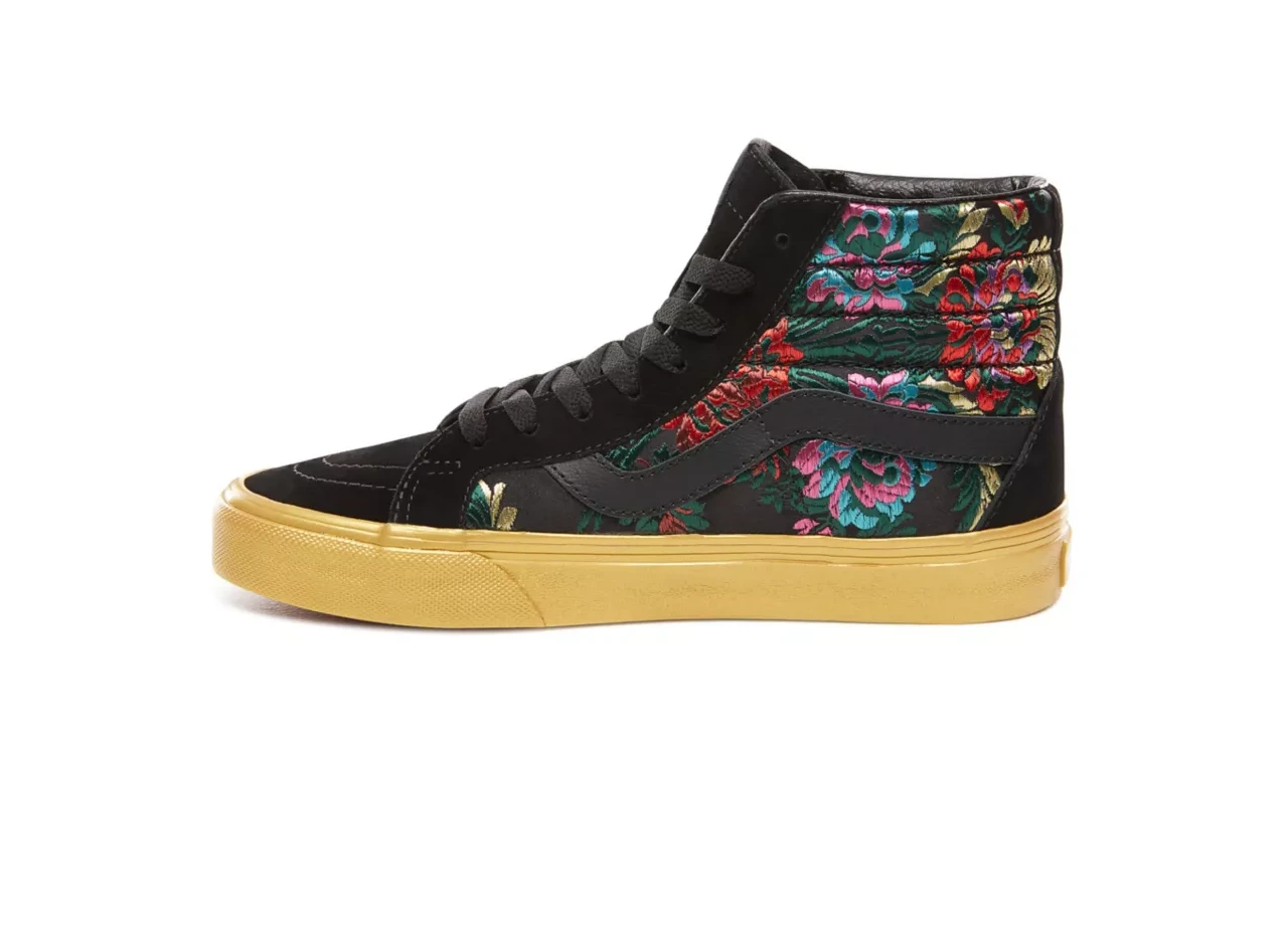 The Festival Satin pack brings a California edge to time-honored floral satin brocade textiles by offering lush satin finishes and ornate details. Featuring the perfect amount of shine and opulence, the Festival Satin Sk8-Hi Reissue combines the reissued legendary Vans high top with sturdy suede and textile uppers, re-enforced toecaps to withstand repeated wear, padded collars for support and flexibility, and signature rubber waffle outsoles.